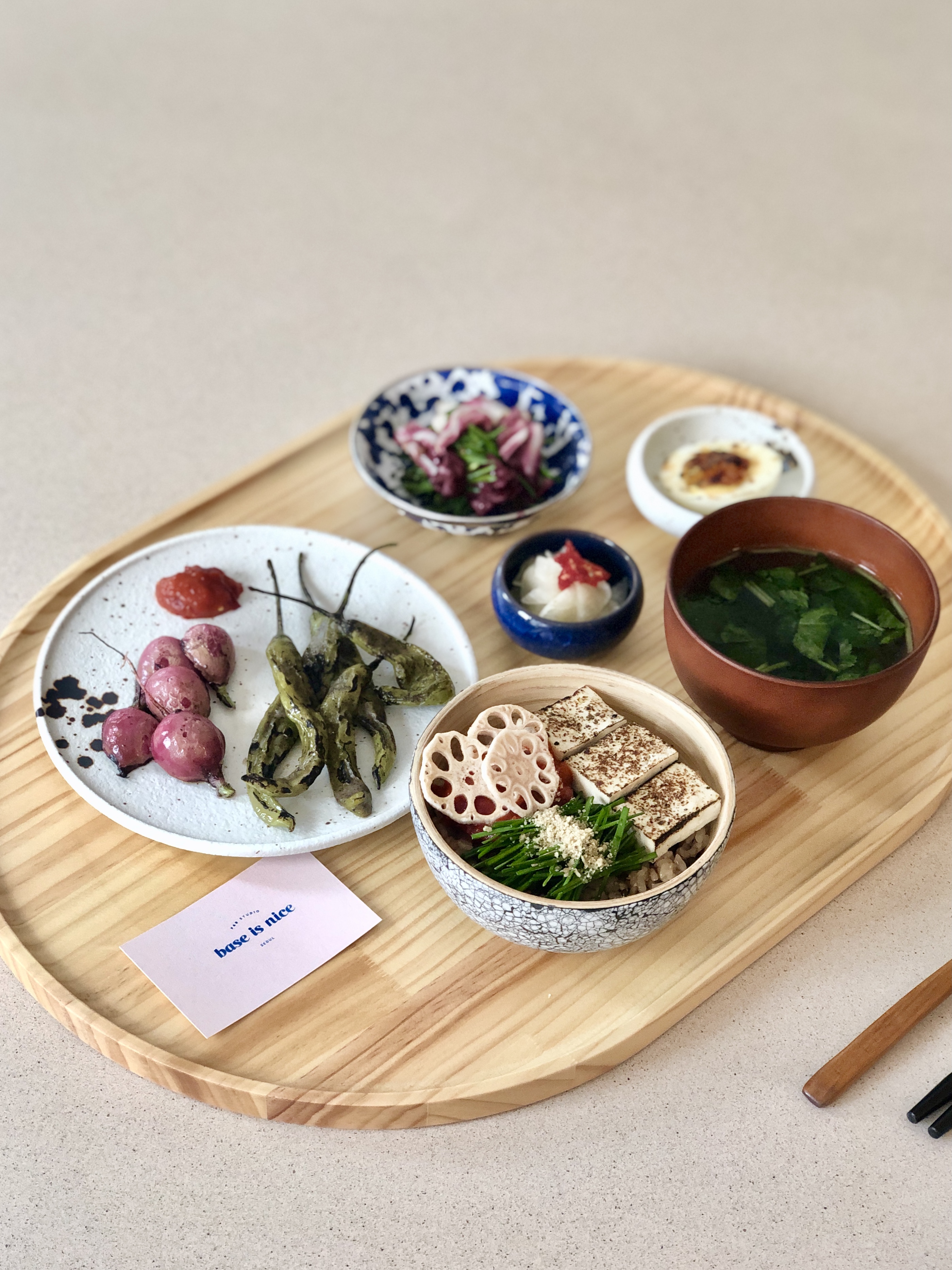 바삭 청무와 옥수수 밥 23,000 | 유기농케일애플망고주스 7,500 | 알배기배추복숭아주스 7,500 | 홍고추퓨레의 구운 두부 밥 23,000 | 발효버터 우엉구이 밥 23,000 | 케일퓌레의 두부콩피 밥 23,000 | 들깨겨자장의 가지고추 밥 23,000