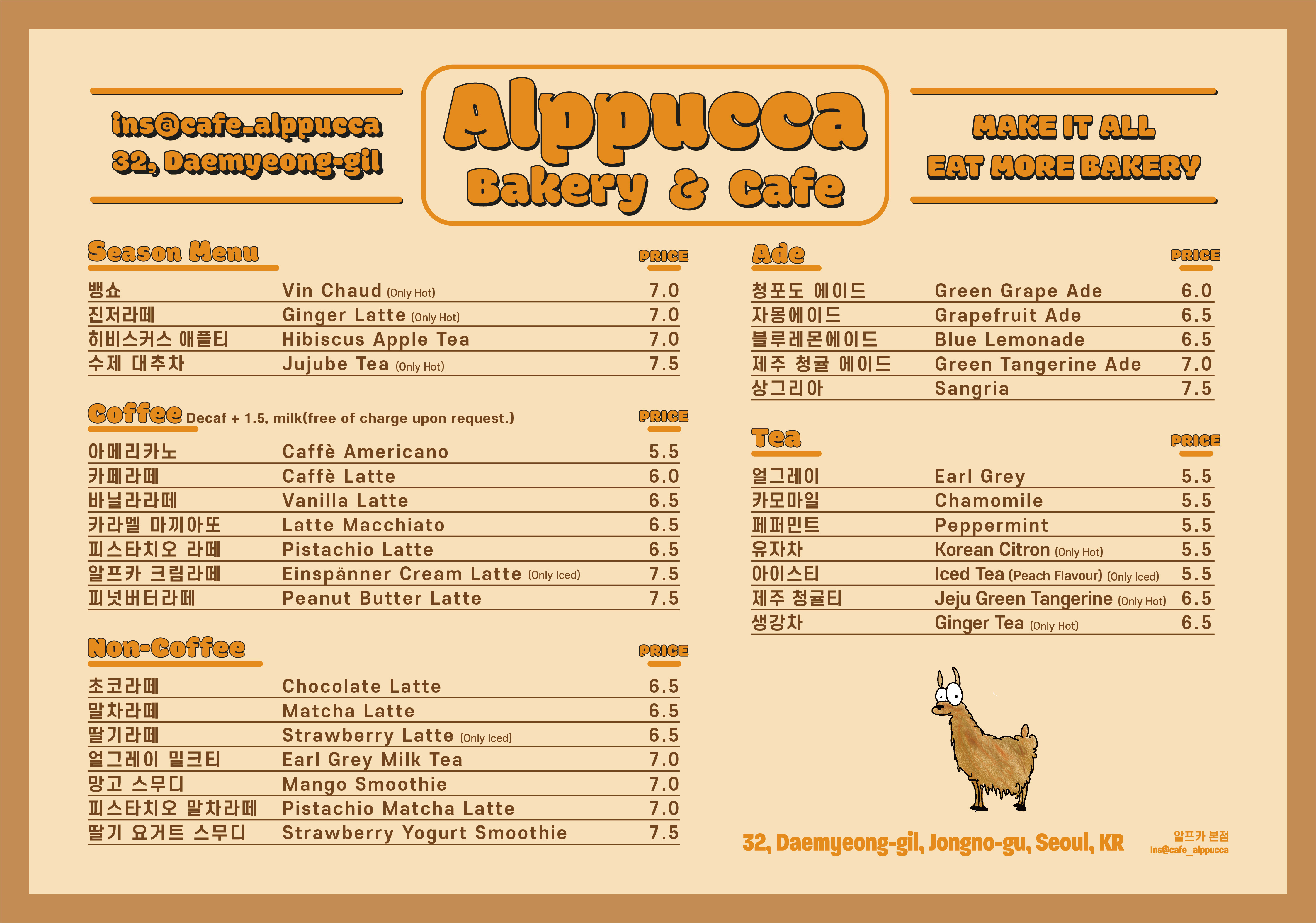 베이컨어니언베이글 4,600 | 쪽파베이글 4,500 | 올리브치아바타 4,800 | 크루아상 3,800 | 딸기크루아상 7,600 | 블루베리크루아상 7,600 | 샤인머스켓크루아상 7,600 | 치즈프레첼 4,500 | 버터프레첼 4,300 | 퀴니아망 4,800 | 더블초코뺑오쇼콜라 5,500 | 소세지페스추리 4,500 | 소금빵 3,500 | 명란소금빵 4,800 | 밤가득식빵 6,800 | 당근라페샌드위치 5,500 | 바질루꼴라샌드위치 6,000 | 잠봉뵈르 샌드위치 6,200 | 딸기조각케이크 9,800 | 초코딸기조각케이크 10,000 | 망고 조각케이크 10,000 | 티라미수 케이크 8,500 | 과일스콘(딸기,망고,블루베리) 4,900 | 망고빙수 16,000 | 눈꽃팥빙수 14,000 | 딸기우유 마카롱 3,300 | 순수우유 마카롱 3,300 | 오레오쿠키 마카롱 3,300 | 초코나무숲 마카롱 3,300 | 돼지바 마카롱 3,300 | 붕어싸만코 마카롱 3,300 | 곰돌이 마카롱 3,300 | 뽀또황치즈 마카롱 3,300 | 크림브륄레 마카롱 3,300 | 딸기크림치즈조개 마카롱 3,700 | 알프카크림라떼 7,500 | 아메리카노 5,500 | 카페라떼 6,000 | 딸기라떼 6,500 | 제주청귤에이드 7,000 | 수박쥬스 (시즌메뉴) 7,500