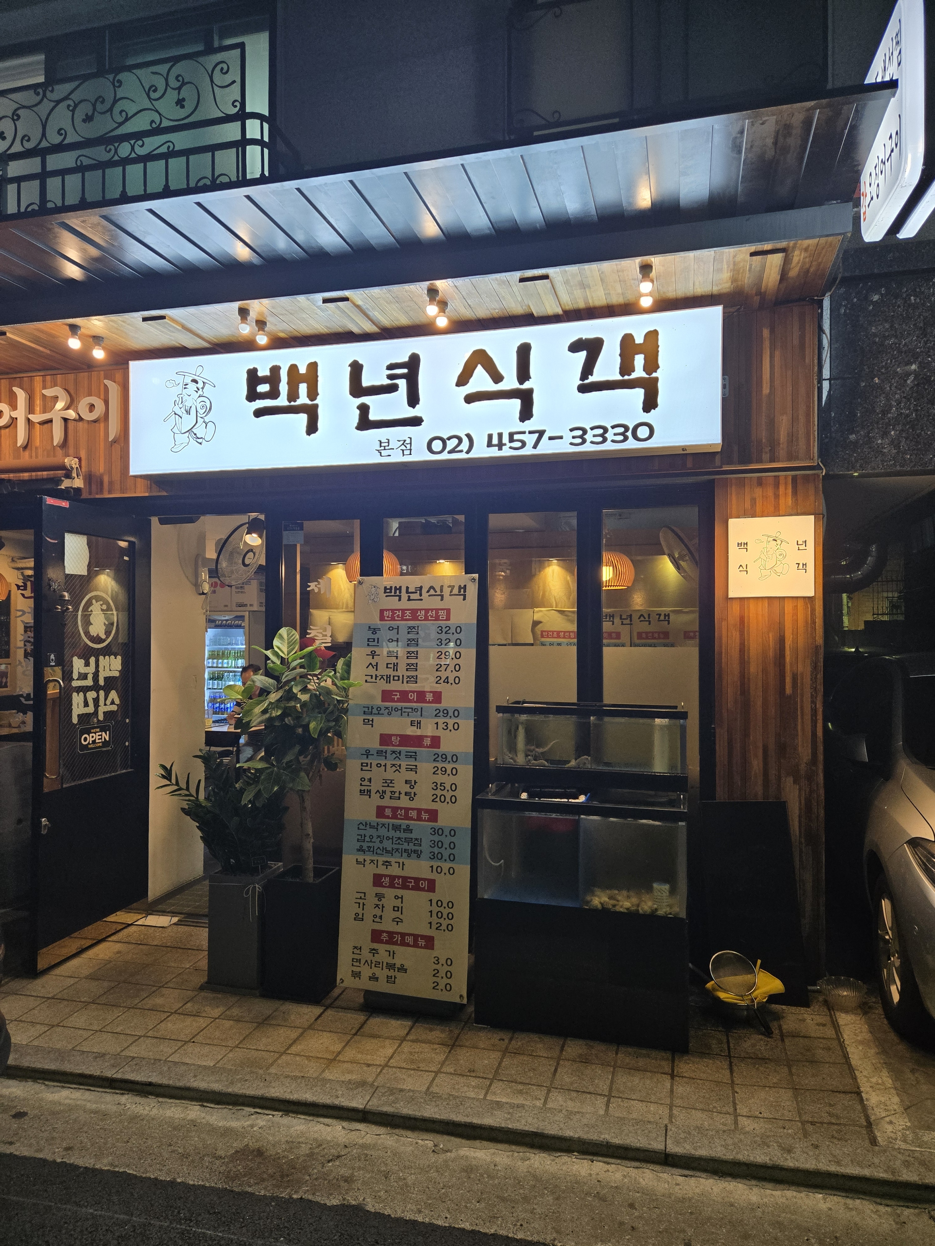 임연수구이 12,000 | 가자미구이 10,000 | 고등어구이 10,000 | 육회산낙지탕탕이 30,000 | 갑오징어초무침 30,000 | 산낙지볶음 30,000 | 백생합탕 20,000 | 연포탕 35,000 | 민어젓국 29,000 | 우럭젓국 29,000 | 먹태 13,000 | 갑오징어구이 29,000 | 전복찜(대) 50,000 | 전복찜(중) 35,000 | 간재미찜 24,000 | 서대찜 27,000 | 우럭찜 29,000 | 농어찜 32,000 | 민어찜 32,000