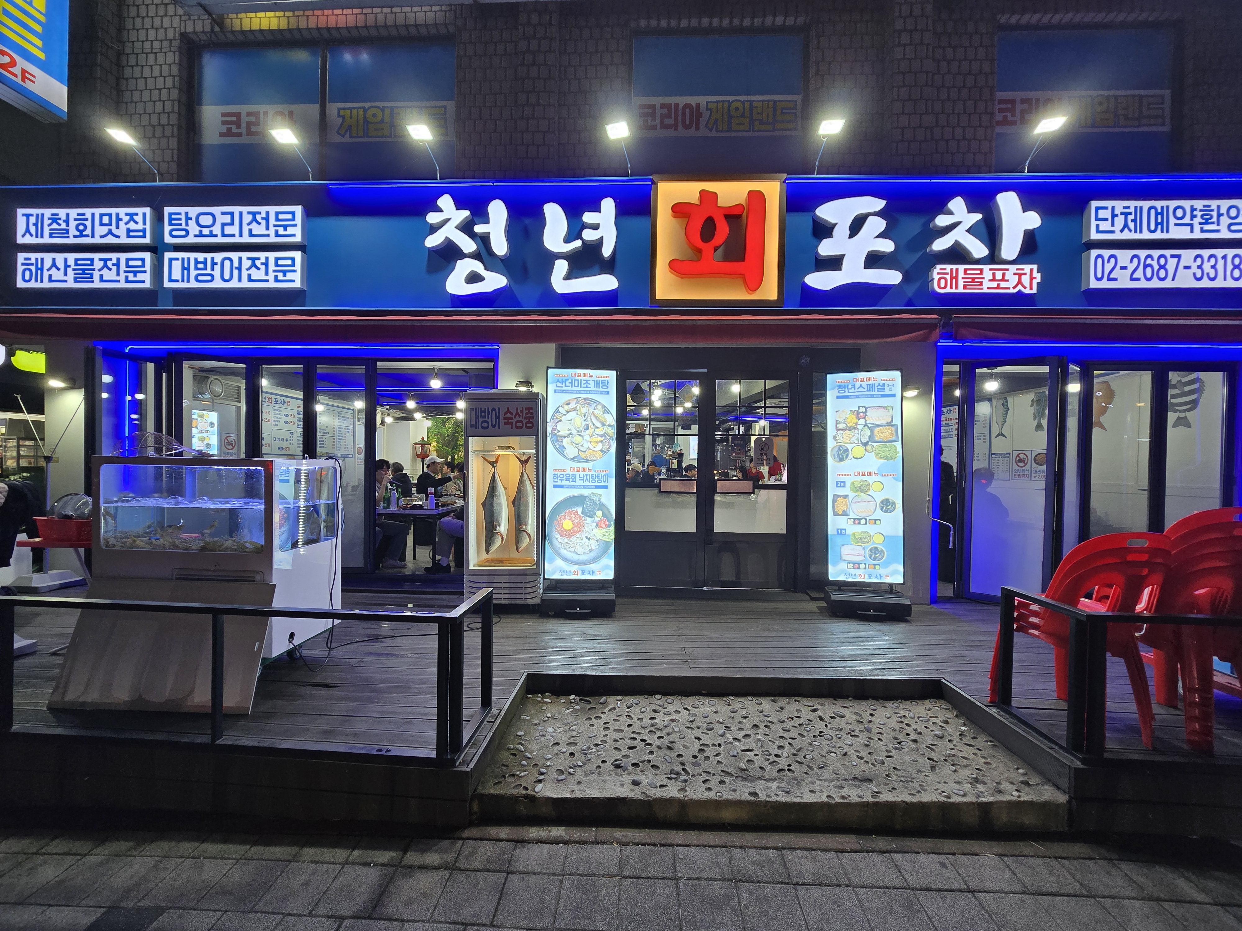 굴찜(25피스이상) 20,000 | 대방어2인 60,000 | 대방어1인 3,500 | 대방어+광.우럭.연어 중택1 2인 55,000 | 청년스페셜 60,000 | 한우육회낙지탕탕이 27,000 | 꼬치오뎅탕 15,000 | 산더미조개탕 15,000 | 모듬해산물물회 3~4인 65,000 | 모듬해산물물회 2인 50,000 | 광어1인 15,000 | 광어 2인 25,000 | 우럭1인 15,000 | 우럭 2인 25,000 | 연어1인 15,000 | 연어 2인 25,000 | 모듬회1인 15,000 | 모듬회 2인 25,000 | 광어+우럭1인 15,000 | 광어+우럭 2인 25,000 | 광어+연어 1인 15,000 | 광어+연어 2인 25,000 | 우럭+연어 1인 15,000 | 우럭+연어 2인 25,000 | 보리숭어 1인 15,000 | 보리숭어 2인 25,000 | 도다리세꼬시 1인 15,000 | 도다리세꼬시 2인 25,000 | 소방어 1인 15,000 | 소방어 2인 25,000 | 전어세꼬시 1인 15,000 | 전어세꼬시 2인 25,000 | 광어세꼬시 1인 15,000 | 광어세꼬시 2인 25,000 | 맛보기모듬해산물 18,000 | 산낙지 15,000 | 전복1미 4,000 | 멍게 15,000 | 해삼 15,000 | 간장새우5미 5,000 | 1인 회무침 15,000 | 1인 활어물회 15,000 | 연어머리구이 15,000 | 통우럭 한마리찜 18,000 | 통우럭 한마리 매운탕 20,000 | 서더리매운탕 7,000 | 회덥밥 10,000 | 왕돈까스 10,000 | 라면사리 1,000 | 칼국수사리 2,000 | 모듬야채사리 5,000 | 우삼겹사리200g 5,000 | 김3봉 1,000 | 묵은지 2,000 | 셀프초밥밥 2,000 | 공기밥 1,000 | 산새우구이500g 12미 20,000