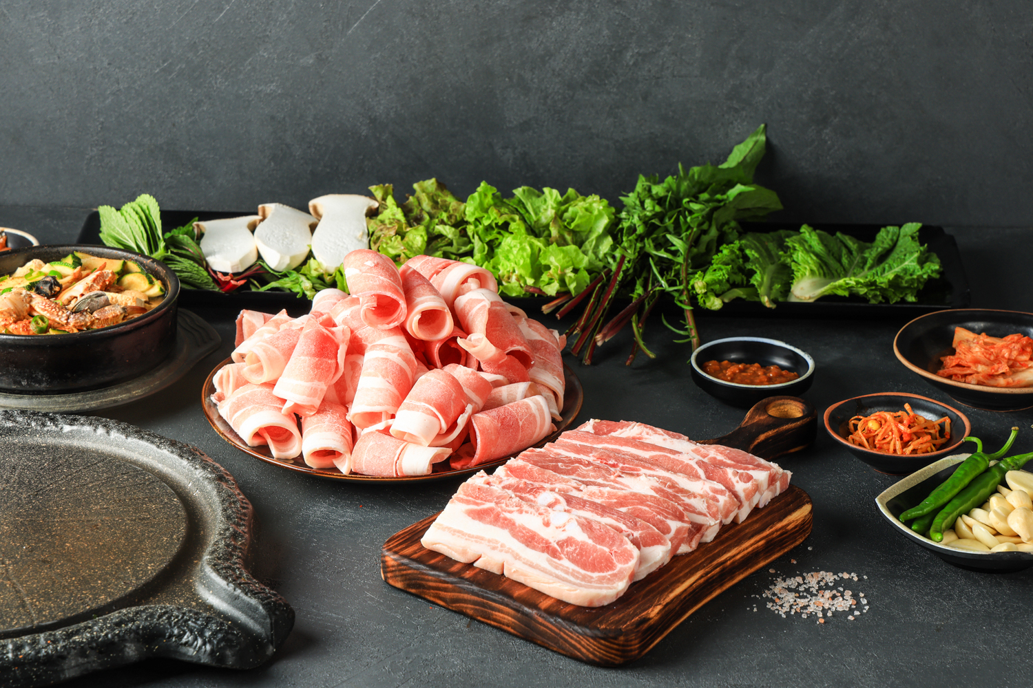 자연석돌구이라는 이름에서 알 수 있듯, 이곳의 특징은 넓적한 돌판 위에서 삼겹살을 구워 먹는다는 점입니다. 일반적인 돼지고기구이집과 달리, 얇게 밀어낸 대패 삼겹살을 사용하여 빠른 조리시간을 자랑합니다. 얇게 썰린 고기는 불판에 올리는 즉시 익기 때문에, 신속하게 쌈을 싸 먹는 것이 중요합니다. 이는 고기의 풍미를 최대한 유지하면서 빠른 회전율을 가능하게 하는 전략으로 보입니다. 고기의 질감은 부드러우면서도 돼지고기 특유의 풍미를 잘 간직하고 있다는 평가가 많았습니다. (단, 정상영업중 상태이므로, 직접적인 경험에 기반한 평가는 불가능합니다.)